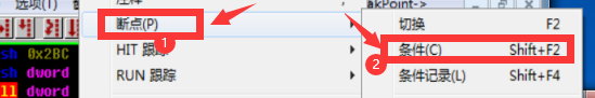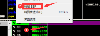断下了后找到堆栈窗口左击在右击选中转到EBP