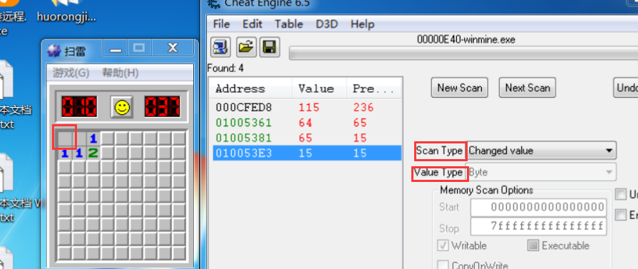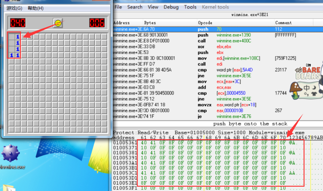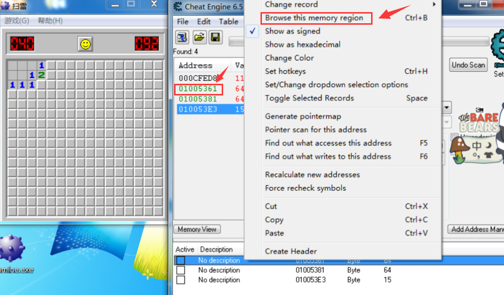 跳转到了内存处,然后在通过多次实验查看基址是否找对,如果基址对头就可以查看当是点击到雷时内存的变化