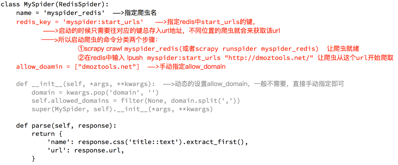 __init__方法,该方法不是必须的,可以手动指定allow_domains - 和scrapy中的crawlspider的区别在于,继承自的父类不相同,redis_key需要添加