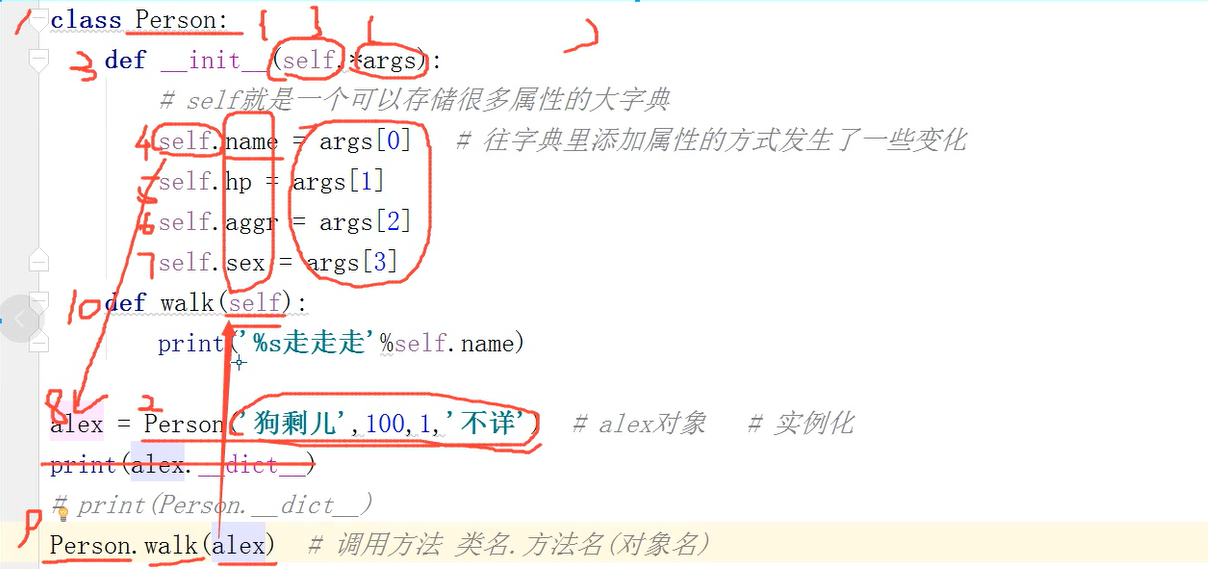 1 class Person: #类名 2 country='China' #静态属性 3 def __init__(self,*args): 4 #self类似一个空字典 5 #print(self.__dict__) 6 self.name=args[0] 7 self.hp=args[1] 8 self.aggr=args[2] 9 self.sex=args[3] 10 def walk(self,n): #这里的self是一个参数,可以进行改变,但是这里必须要传递参数,这里的参数就是下面实例化的对象 11 print("%s走了%s步"%(self.name,n)) 12 13 print(Person.country) #类名 可以查看类中的属性,不需要实例化就可以查看 14 15 xiaoling=Person("邓晓灵",200,20,"f") #实例化 16 17 print(xiaoling.__dict__) #查看所有属性值 18 print(xiaoling.country) #查看属性值 19 20 Person.walk(xiaoling,5) #调用方法 类命.方法名(对象名) 21 xiaoling.walk(5) #对象名.方法名(参数) 22 23 print(Person.__dict__) #这个的结果为字典 24 print(Person.__dict__['country']) #China 25 26 Person.__dict__['country']='japan' 27 print(Person.__dict__['country']) #'mappingproxy' object does not support item assignment 对于类的字典,只能查看,无法修改。 28 29 print(xiaoling.__dict__["name"]) #邓晓灵 30 xiaoling.name='二狗' #修改 31 print(xiaoling.__dict__['name']) #二狗