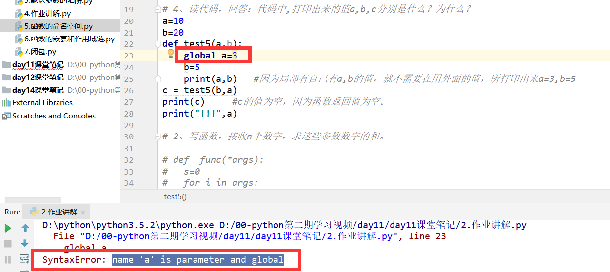 1 a=10 2 b=20 3 def test5(a,b): 4 a=3 5 b=5 6 print(a,b) #因为局部有自己有a,b的值,就不需要在用外面的值,所打印出来a=3,b=5 7 c = test5(b,a) 8 print(c) #c的值为空,因为函数返回值为空。