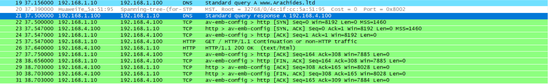 (2)当接受到DNS服务器的回应时,客户端知道了www.Arachides.ltd的地址是192.168.4.100。因为客户端与HTTP服务器是HTTP连接,HTTP连接要先建立TCP连接,所以要先建立三次握手。