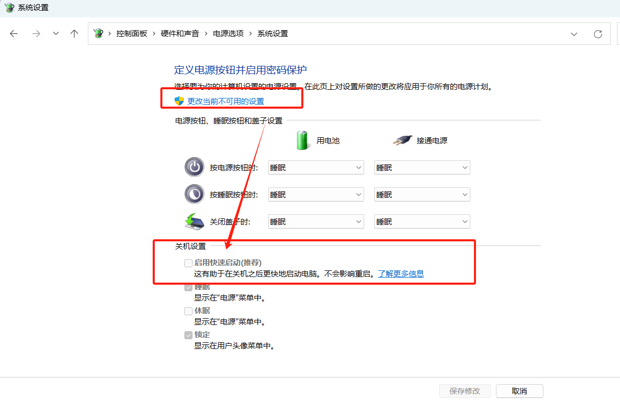 4、点击上面“更改当前不可用设置”后,把下面“启用快速启动的√去掉”。