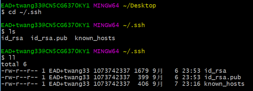 我们可以先切换到~/.ssh目录下,然后执行ls查看是否有公钥文件,如下图所示: