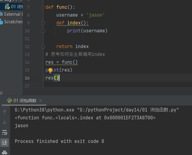 def func(): username = 'jason' def index(): print(username) return index # 思考如何在全局调用index res = func() print(res) res()