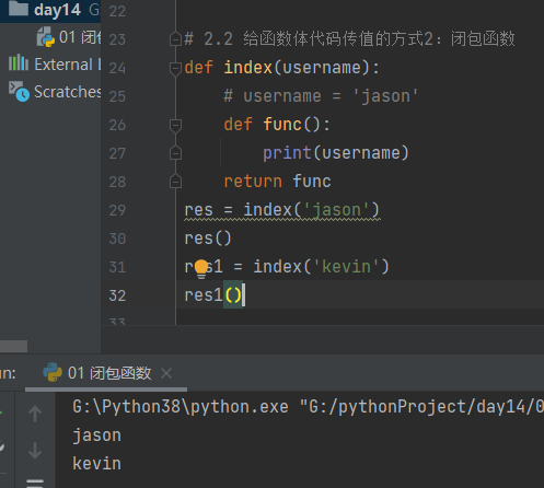 def index(username): # username = 'jason' def func(): print(username) return func res = index('jason') res() res1 = index('kevin') res1()