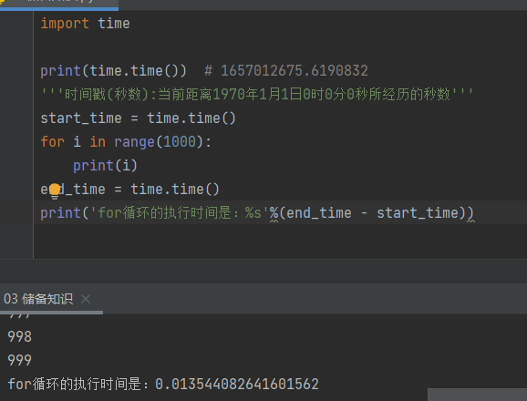 import time print(time.time()) # 1657012675.6190832 '''时间戳(秒数):当前距离1970年1月1日0时0分0秒所经历的秒数''' start_time = time.time() for i in range(1000): print(i) end_time = time.time() print('for循环的执行时间是:%s'%(end_time - start_time))