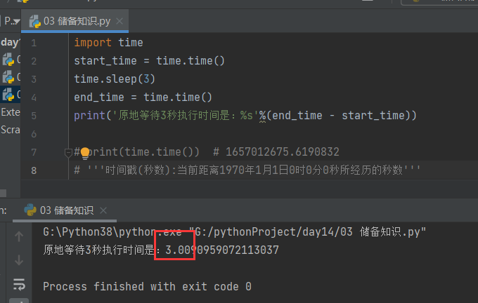 import time start_time = time.time() time.sleep(3) end_time = time.time() print('原地等待3秒执行时间是:%s'%(end_time - start_time))