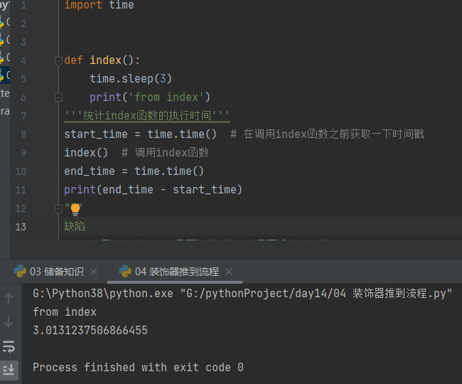 import time def index(): time.sleep(3) print('from index') '''统计index函数的执行时间''' start_time = time.time() # 在调用index函数之前获取一下时间戳 index() # 调用index函数 end_time = time.time() print(end_time - start_time)