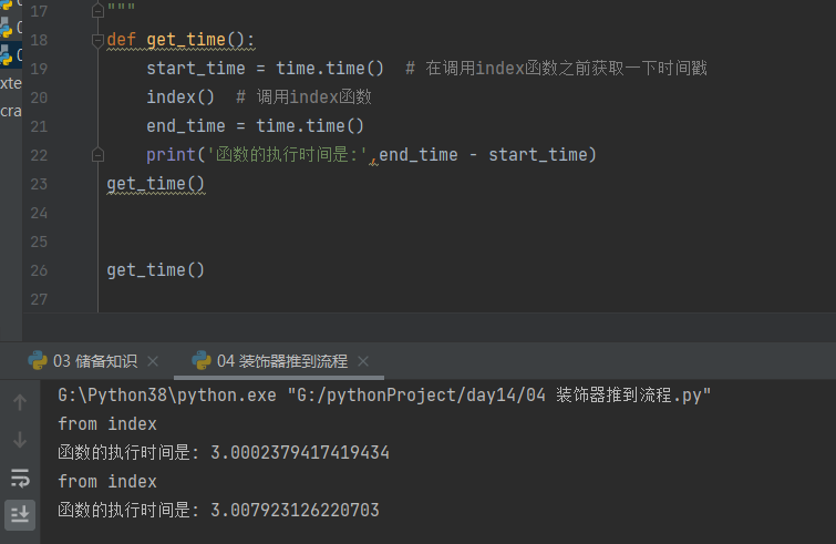 import time def index(): time.sleep(3) print('from index') def get_time(): start_time = time.time() # 在调用index函数之前获取一下时间戳 index() # 调用index函数 end_time = time.time() print('函数的执行时间是:',end_time - start_time) get_time() get_time()