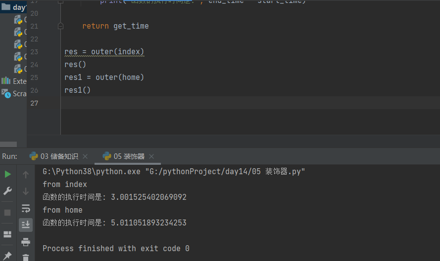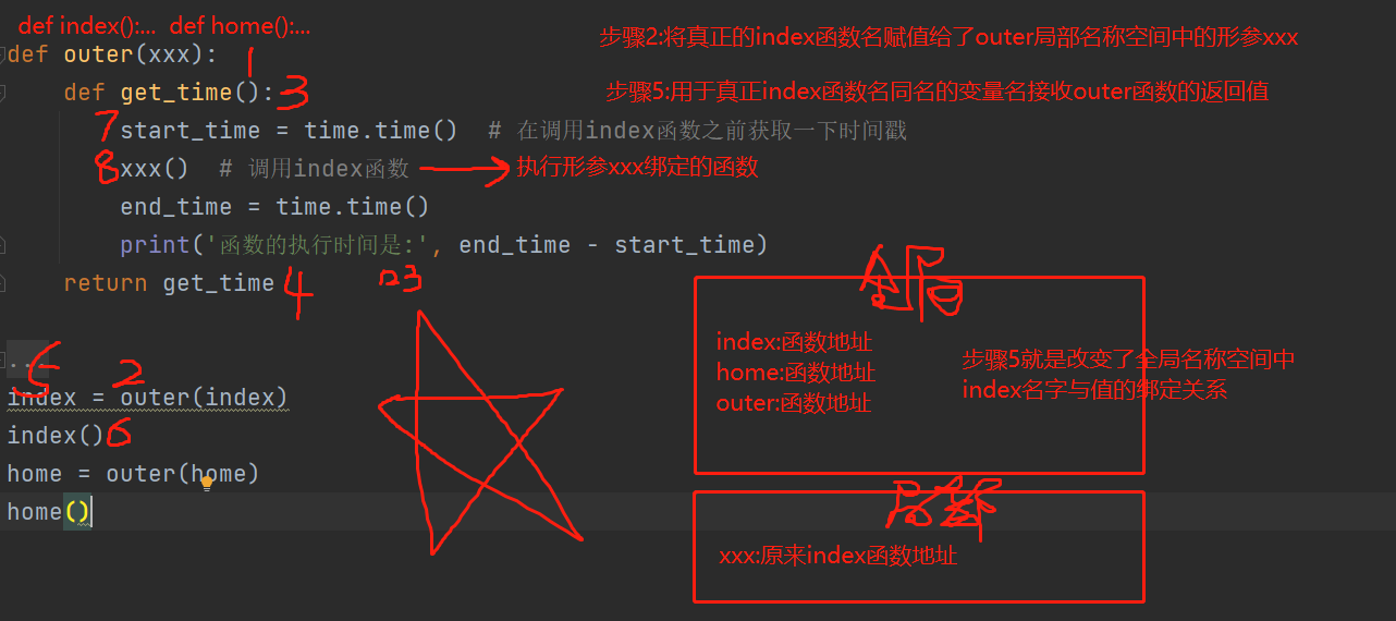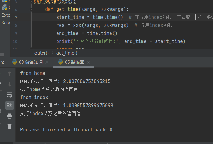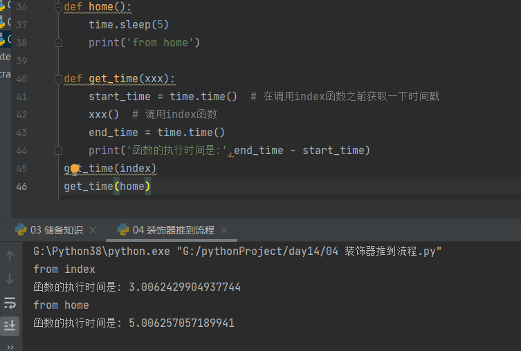 def home(): time.sleep(5) print('from home') def get_time(xxx): start_time = time.time() # 在调用index函数之前获取一下时间戳 xxx() # 调用index函数 end_time = time.time() print('函数的执行时间是:',end_time - start_time) get_time(index) get_time(home)