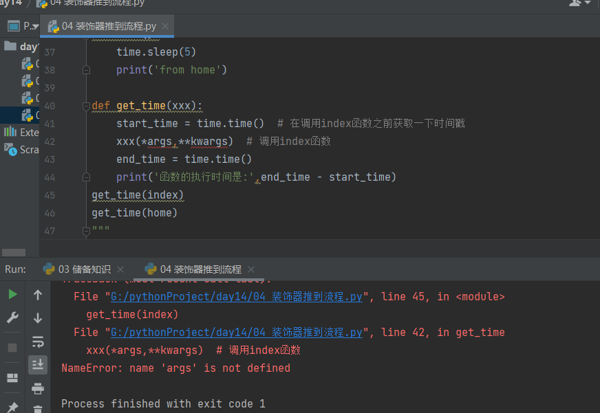 # 1.第一种直接利用形参的形式传参无法实现不改变调用方式 def get_time(xxx): start_time = time.time() # 在调用index函数之前获取一下时间戳 xxx() # 调用index函数 end_time = time.time() print('函数的执行时间是:',end_time - start_time)