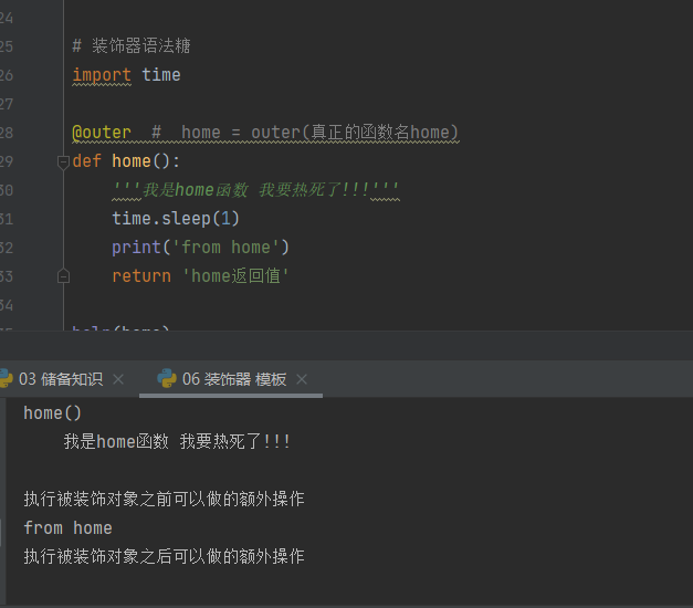 from functools import wraps def outer(func_name): @wraps(func_name) # 仅仅是为了让装饰器不容易被别人发现 做到真正的以假乱真 def inner(*args, **kwargs): print('执行被装饰对象之前可以做的额外操作') res = func_name(*args, **kwargs) print('执行被装饰对象之后可以做的额外操作') return res return inner import time @outer # home = outer(真正的函数名home) def home(): '''我是home函数 我要热死了!!!''' time.sleep(1) print('from home') return 'home返回值' help(home) home()