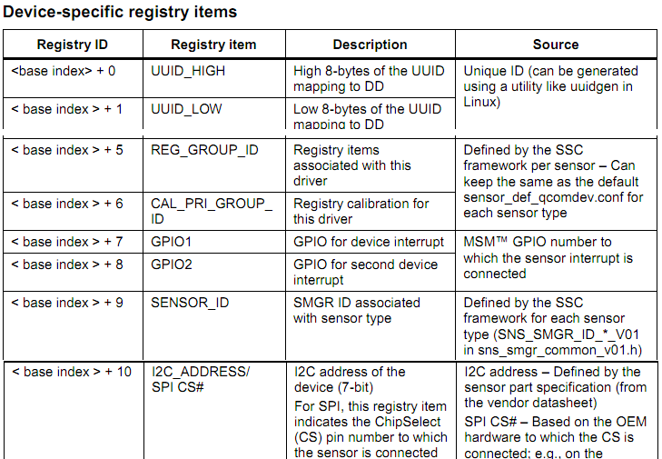 对于设备配置项的格式应按照:<Registry ID> <Value> <Version>来做具体的配置,Registry ID的定义应对应到vendor/qcom/proprietary/sensors/dsps/api/sns_reg_api_v02.h 中的具体配置。