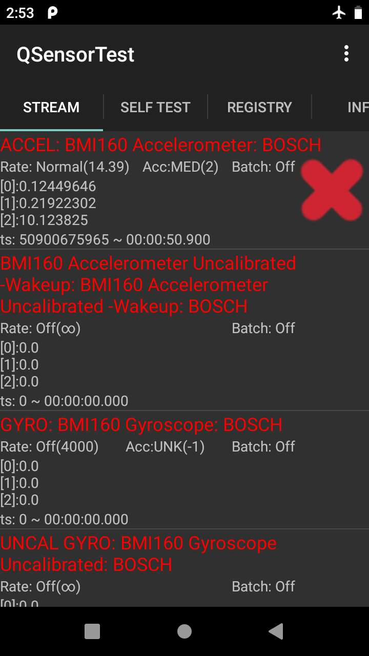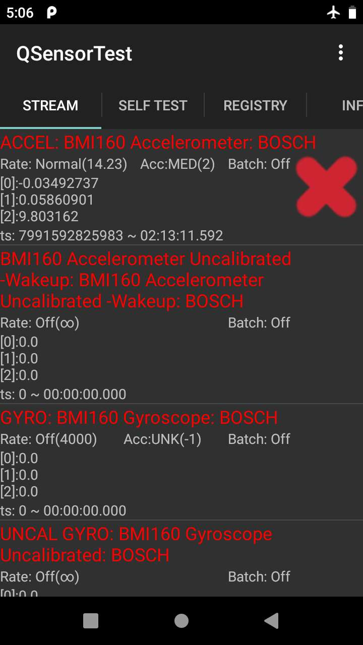 进入qsensortest app 后,正常加载的sensor 会出现在sensor list当中,点击acc 启动sensor,界面如下:
