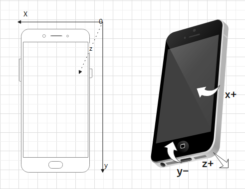 - 以z轴为例,平行放置时,有个向下的重力加速度,z轴的数据是 +9.8左右,水平翻转180度平行放置(屏幕向正下方),z轴的数据是 -9.8左右;