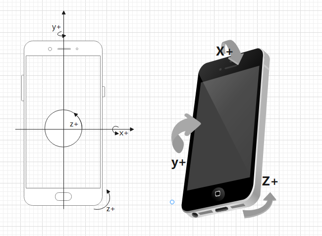 - 以x轴为例,平行放置时,x轴无加速度,数据接近0,按照下图的方向旋转设备,x轴(即第一组[0])数据 会正向增加,旋转到90度,数值 +9.8左右;