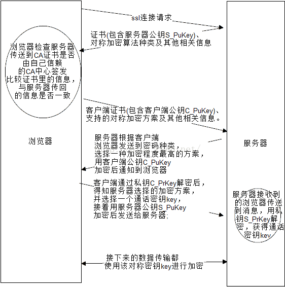(1) 浏览器发送一个连接请求给服务器;服务器将自己的证书(包含服务器公钥S_PuKey)、对称加密算法种类及其他相关信息返回客户端;