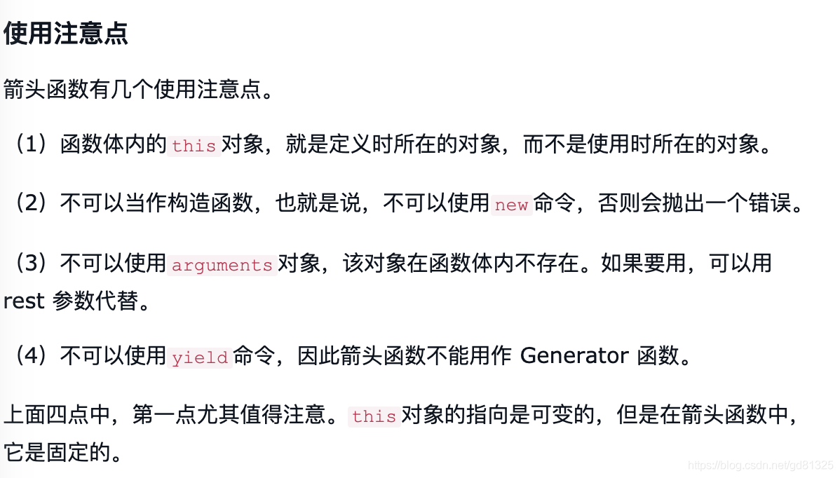这道题都会选C然后带几个其他选项,正确答案是BC,经常会有人把ADF也选上,D不说了就当没有读通题目,剩余的就直接看ES6官网箭头函数的使用注意点,熟记