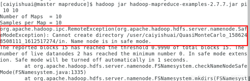 hadoop jar hadoop-mapreduce-examples-2.7.7.jar pi 10 10