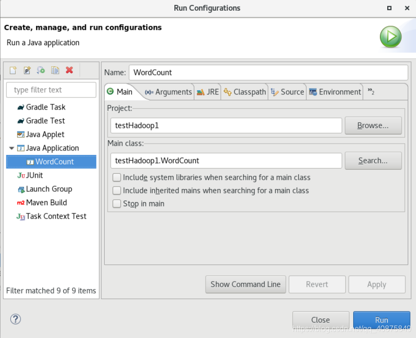 双击右侧“Java Appliction”,会自动显示“WordCount”,在“main”标签页,查看相关信息是否正确,