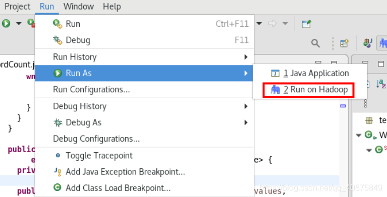 可以选择在菜单中选择“Run As”,或者程序上点击鼠标右键,弹出的快捷菜单里选择“Run As”,“Run on Hadoop”。