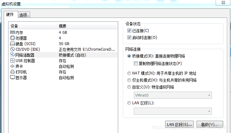 - 开启本组所有电脑(4台),拷贝虚拟机映像,打开。在开启虚拟机之前,设置虚拟机内存是4G,处理器是4,网络连接是桥接模式。