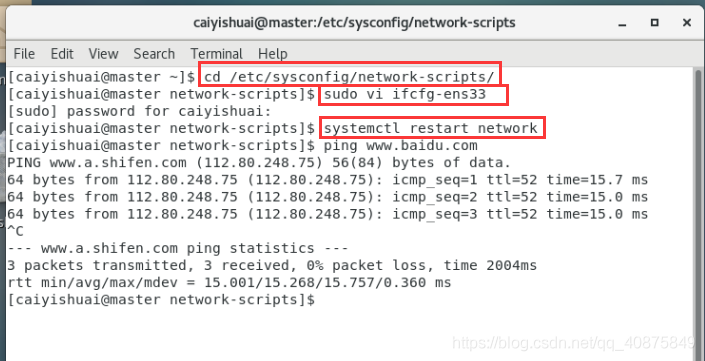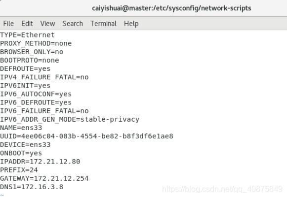 - 编辑网络配置文件:/etc/sysconfig/network-scripts/ifcfg-ens33。