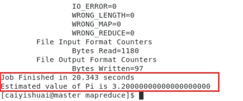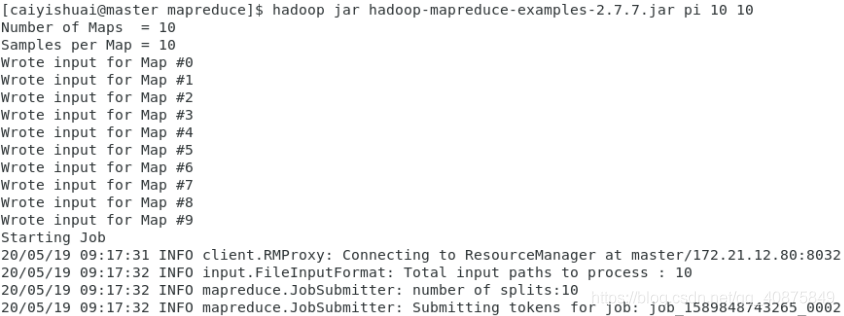 - 进入相应目录hadoop-2.7/share/hadoop/mapreduce,运行命令:hadoop jar hadoop-mapreduce-examples-2.7.7.jar pi 10 10
