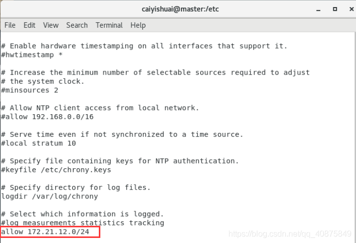 - 选择一个本地时钟服务器,对于时钟服务器修改cd /etc sudo vi chrony.conf,要允许其他节点进行连接,
