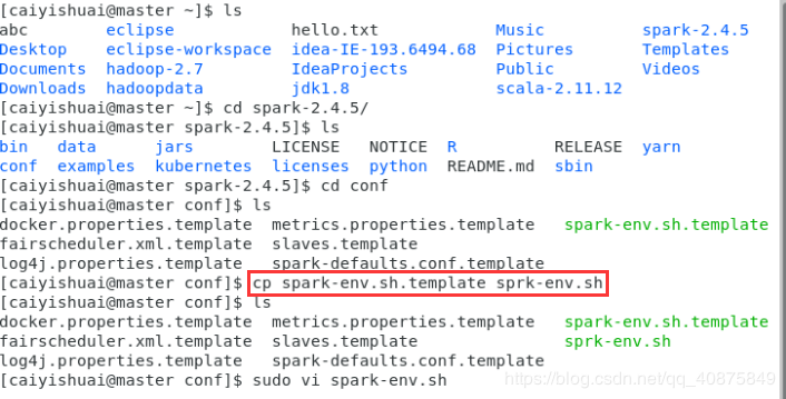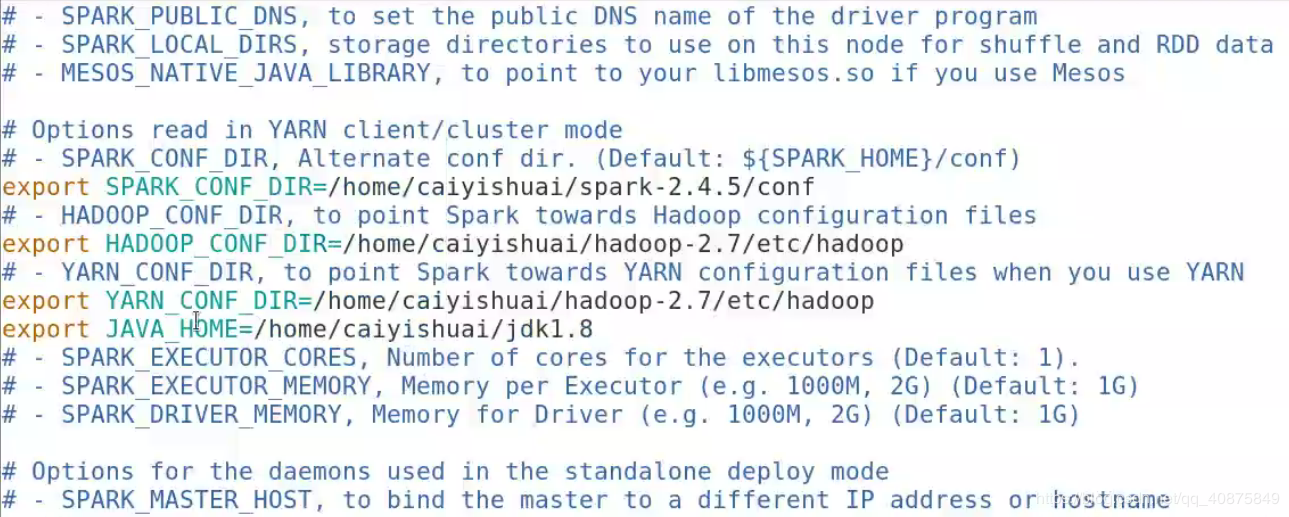 - 编辑:vi spark-env.sh,添加如下内容,红色部分替换成自己的目录。