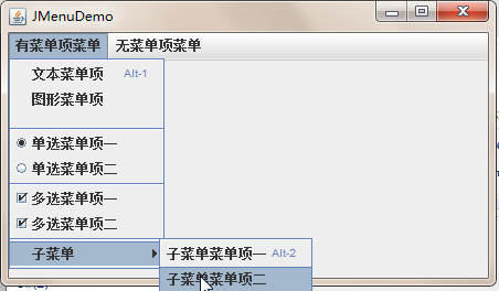menu = new JMenu("有菜单项菜单"); // 创建第一个菜单