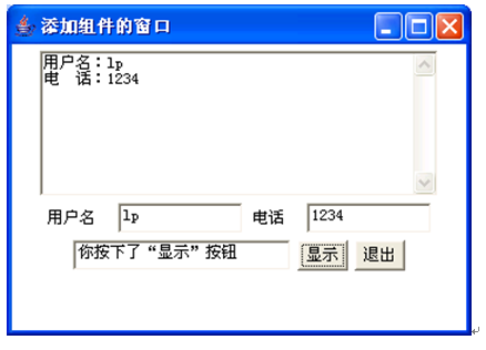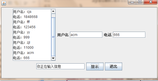 编写程序:在窗口中添加组件,产生如下图形化界面:当用户输入用户名和电话后,点击显示按钮后,按下图格式显示。