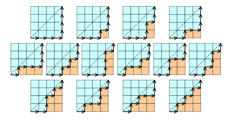 下图是5×5的网格的最短路径(不超过对角线)的所有情况