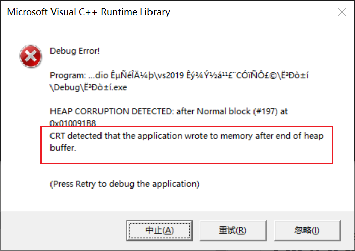 问题解释:CRT检测到应用程序在堆缓冲区结束后写入内存。