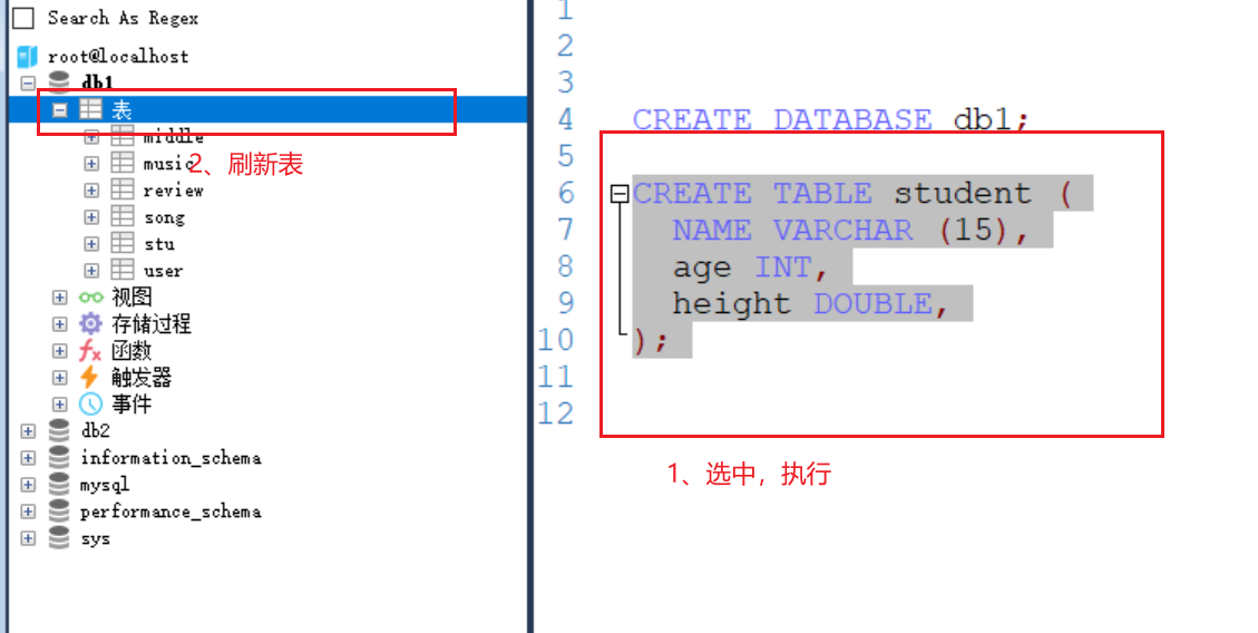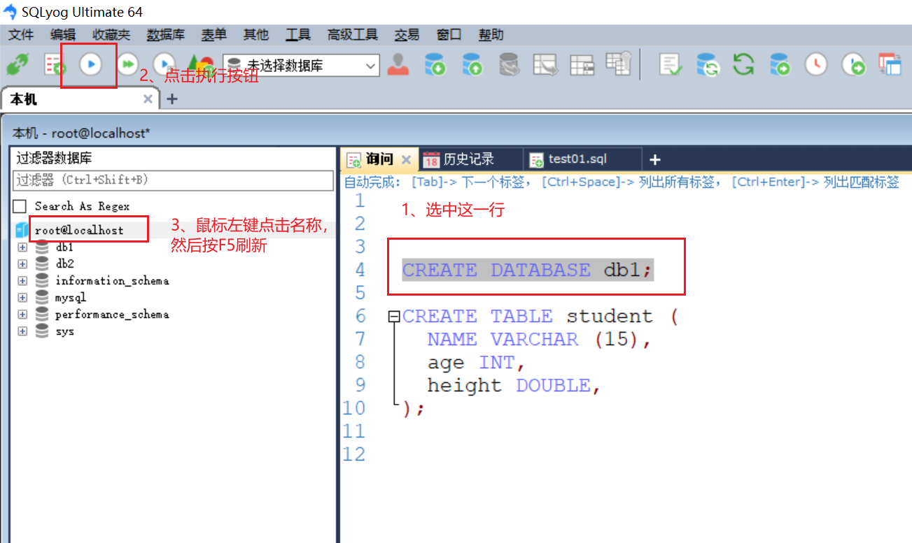 在正中央的【查询编辑器】中,输入CREATE DATABASE db1;,然后选中这一行,点击上方工具条的【执行】键,创建成功。