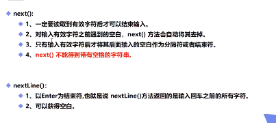 Java中Scanner类有两个方法来获取用户的输入:next()和nextline()。同时还有hasNext()和hasNextLine()这两个方法来判断用户是否还在输入。