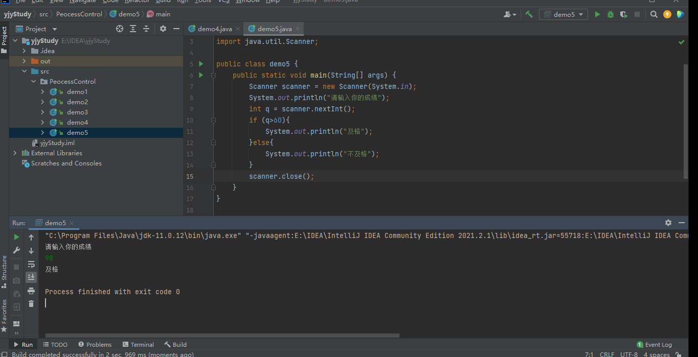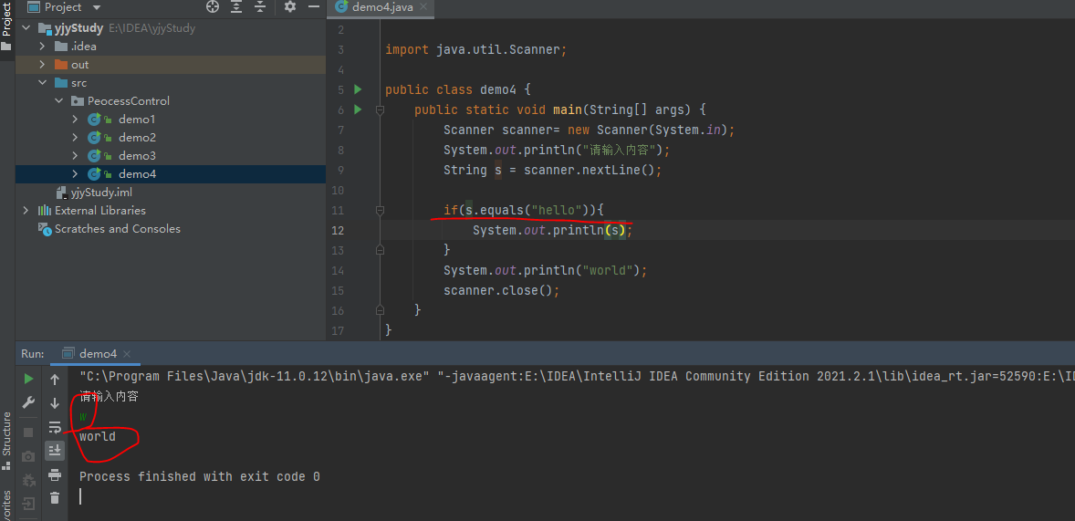 这里可以看到当我输入的不是hello时,控制台输出的是world,也就是程序并没有执行if语句块,这是因为s.equals()这个方法是判断s这个变量是不是等于hello这个值,如果是等于的话,那么这个方法返回的值就是true,也就是if语句块会执行括号里面的语句。