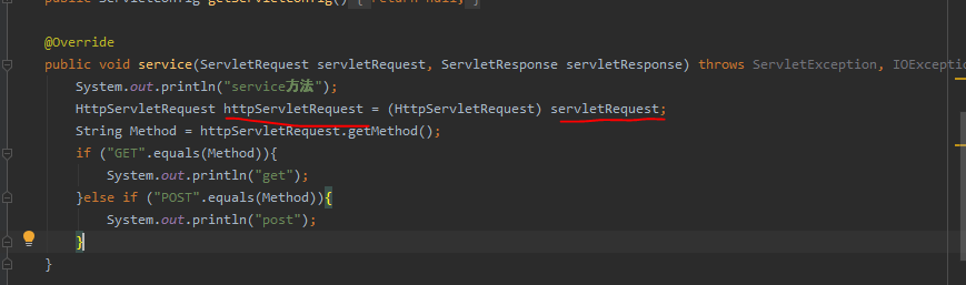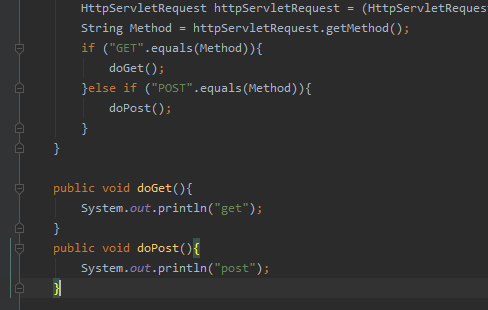 这里原有的ServletRequest类里面是没有获取请求类型的方法,因此必须要转化为他的子类也就是HttpServletRequest类,通过这个类然后再创建实例对象Method获取请求类型,然后再通过判断使用相应的请求方法。