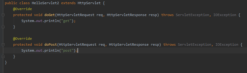 但是我们一般在项目实际操作中都会创建一个类然后继承HttpServlet父类,并且重写父类里面的doGet和doPost方法,如下图所示:
