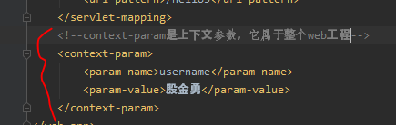 第一个作用的实现:首先我们需要在web.xml中写入他的上下文参数<context-param>,如下图所示: