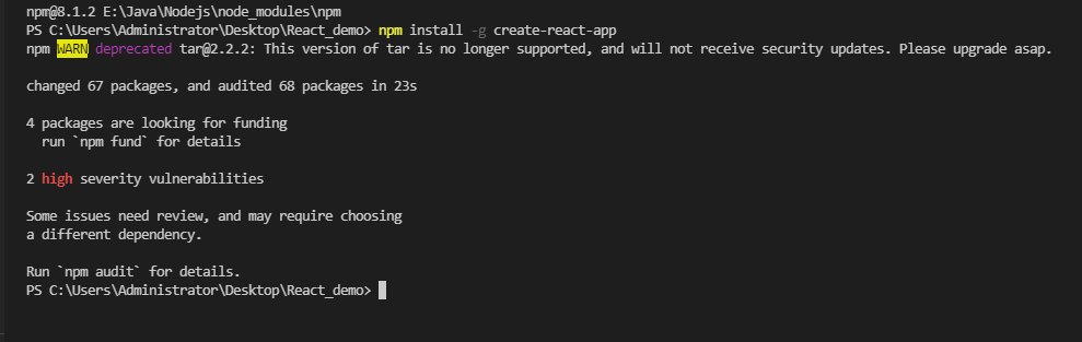 第二步下载使用npm下载脚手架这个工具:npm install -g create-react-app (卸载下载好的脚手架:npm uninstall -g create-react-app)