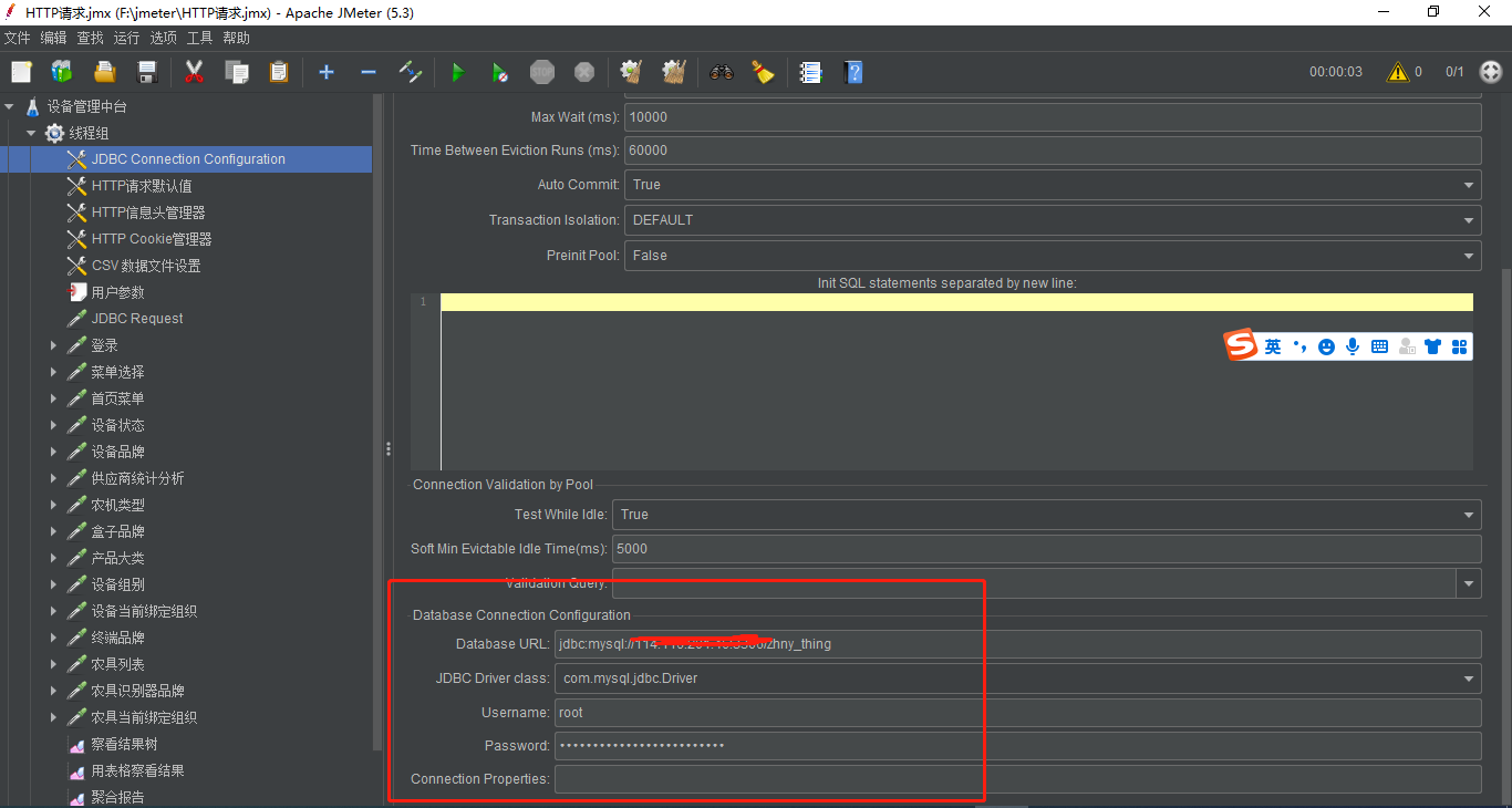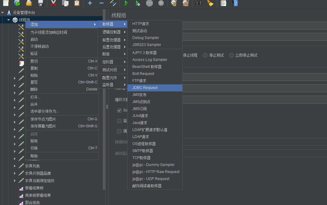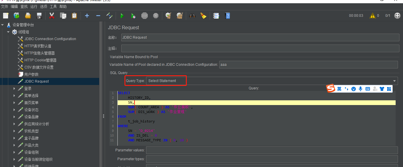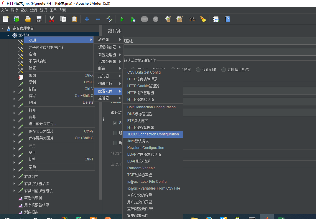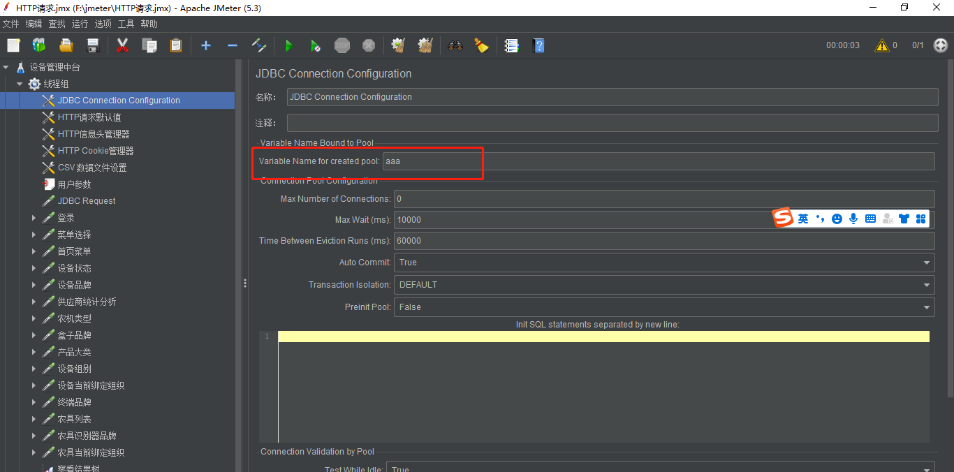 6. 添加jdbc请求,变量名填写:aaa,表名你需要连接上一步数据库进行操作