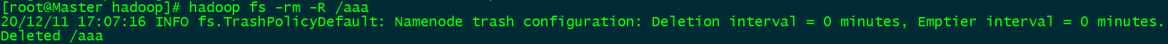 rm -R:使用方法:hadoop fs -rm -R/(将目标文件目录从hdfs系统中删除)