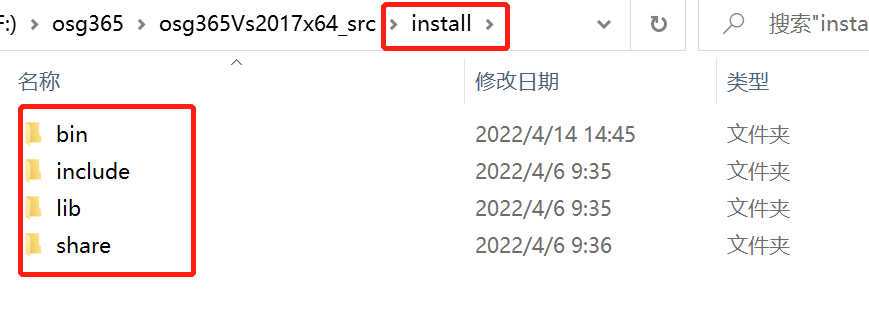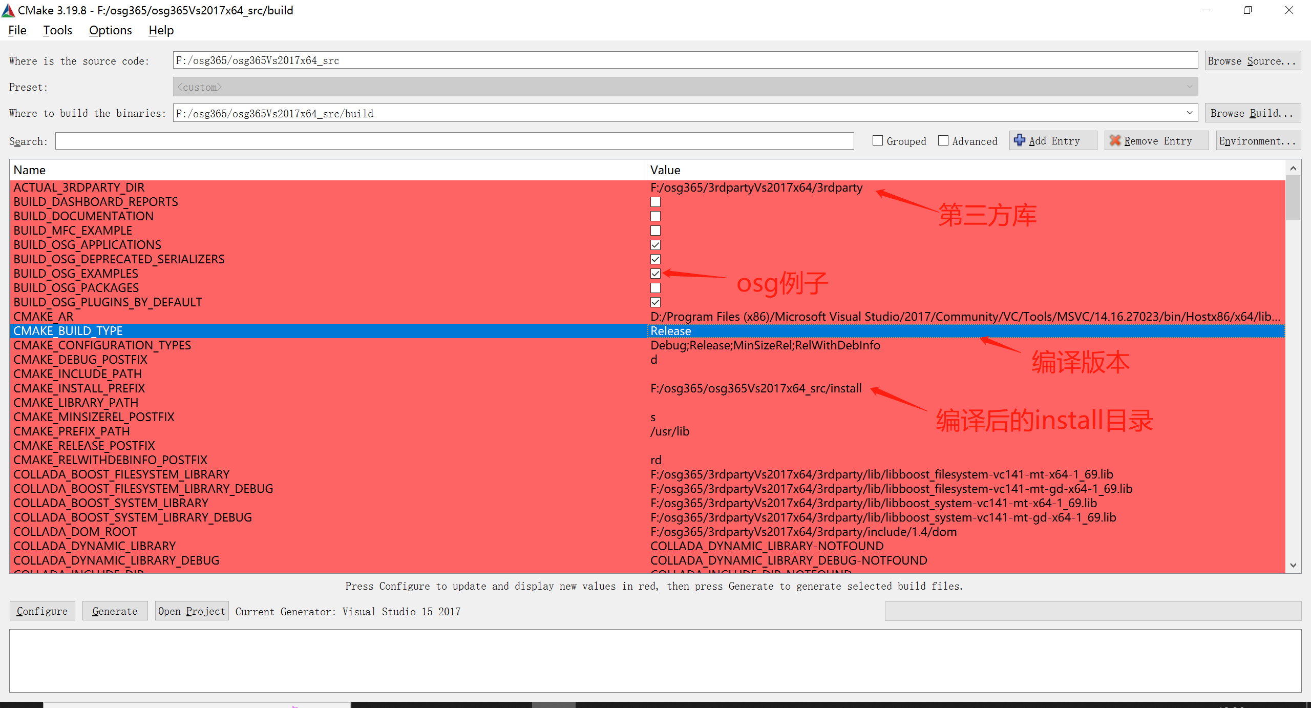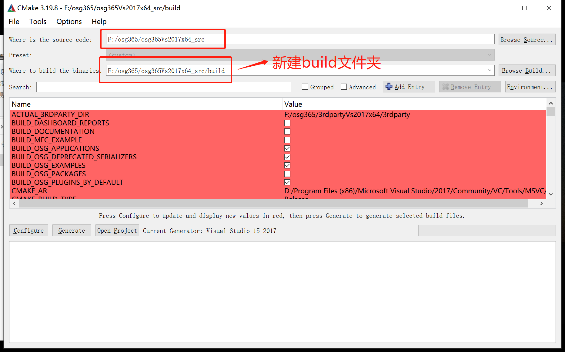 1.打开osg源码目录,新建build和install文件夹。打开cmake,分别选择源码文件夹和bulid文件夹。