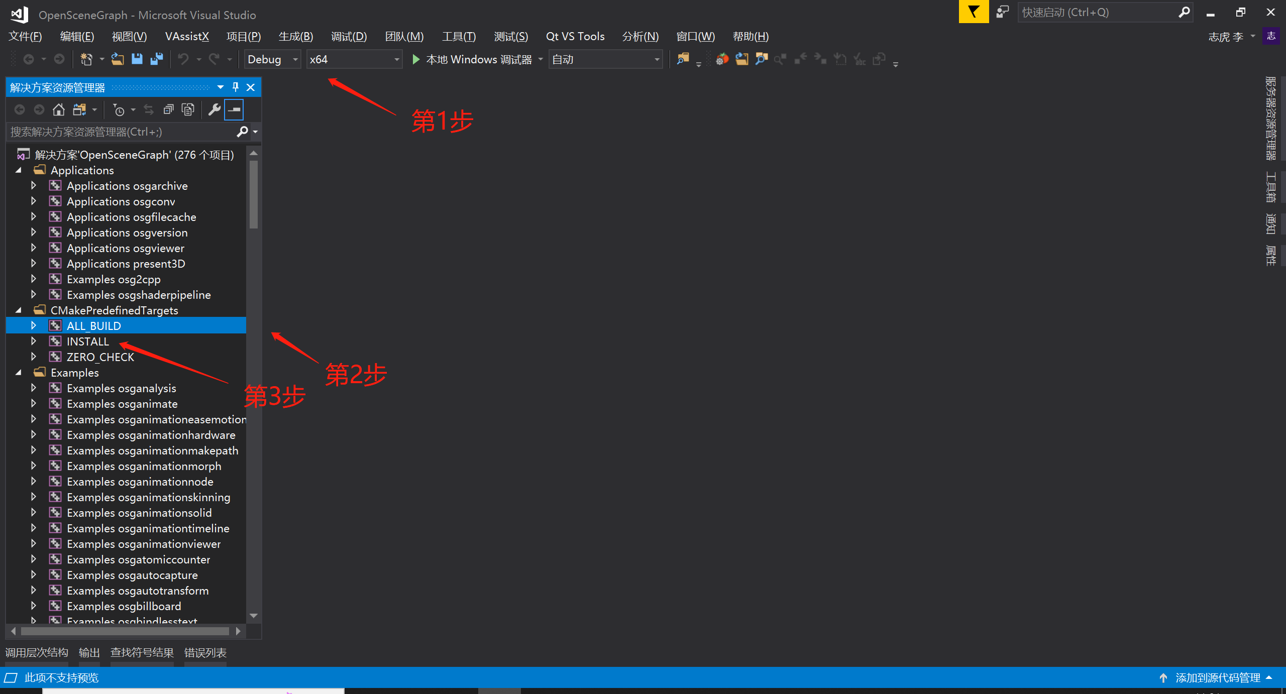 6.打开工程后,先选择debug-x64;再右键单击ALL_BUILD工程生成,若camke配置没问题的话,经过漫长的等待,提示全部成功;最后,右键单击Install工程生成,就会将生成的库拷贝到cmake设置的install路径下。