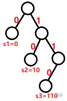如图(样例1),若将除了叶节点的每个节点,左儿子标上 0,右儿子标上 1,则从根到每个叶结点的路径上经过的数连起来,就是这个叶节点对应的字符串。