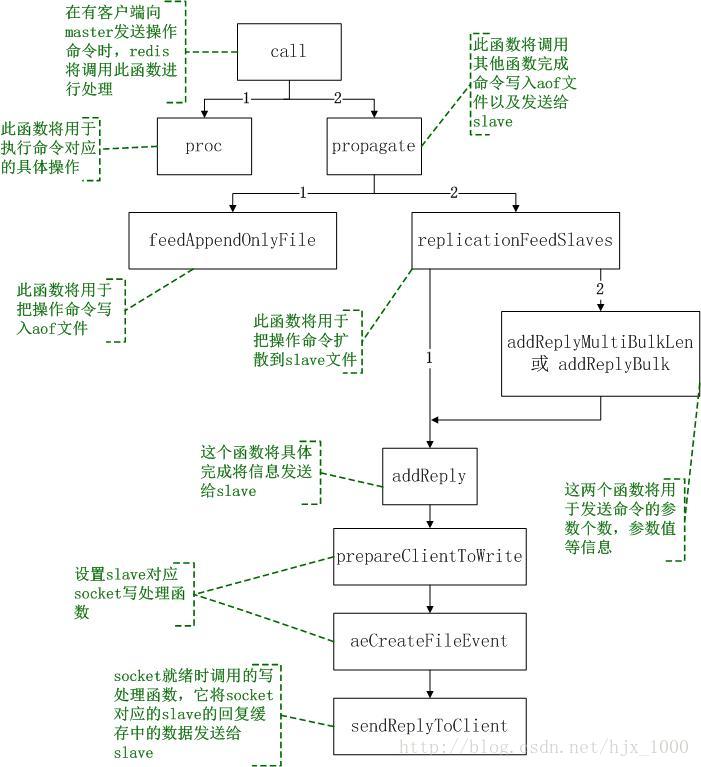 (1)master接收到一条用户的操作后,将调用函数call函数来执行具体的操作函数(此过程可参考另一文档《redis命令执行流程分析》),在该函数中首先通过proc执行操作函数,然后将判断操作是否需要扩散到各slave,如果需要则调用函数propagate()来完成此操作。