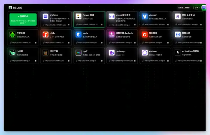 目前,BBlog 目前已经支持创建多个站点,即可以同时创建多个数字名片主页,满足用户的多种使用场景需求。