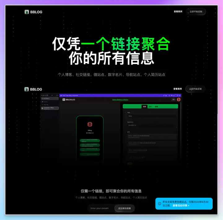 简介:使用一个链接高效聚合展示你的站点信息,高效分享你的的数字名片和信息主页。其中,链接支持域名自定义,支持 SEO优化以及设计界面个性化设置。